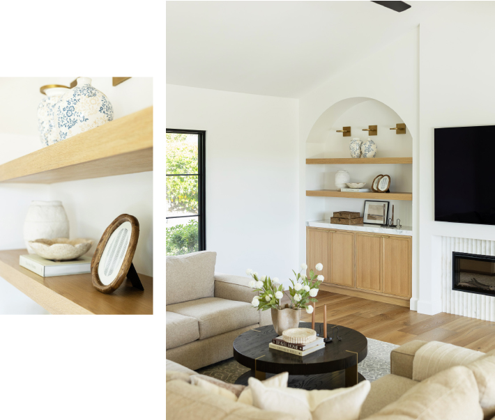 It's the details that bring this home to life: layered styling, organic textures and curated moments throughout. Open shelving and built-ins are styled with a mix of natural ceramics, soft greenery and collected objects, adding personality without clutter.
