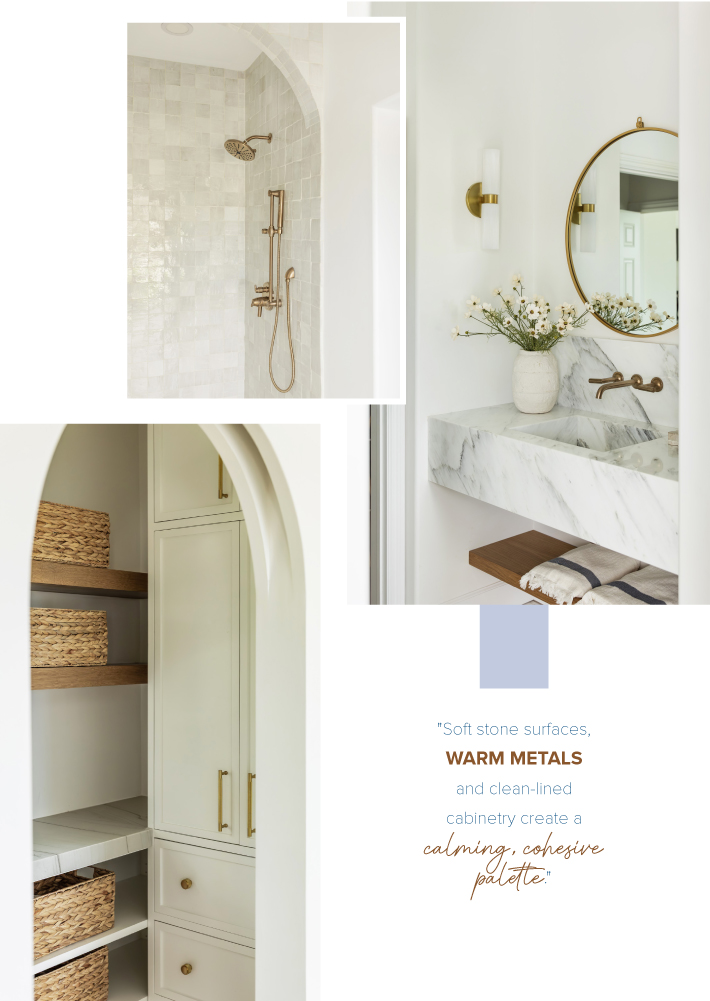 Soft, layered neutrals create a calming foundation, while white oak cabinetry and warm wood flooring introduce depth and warmth. Thoughtfully-selected natural stone surfaces and subtle veining add a quiet elegance, allowing the materials to speak without overwhelming the space.