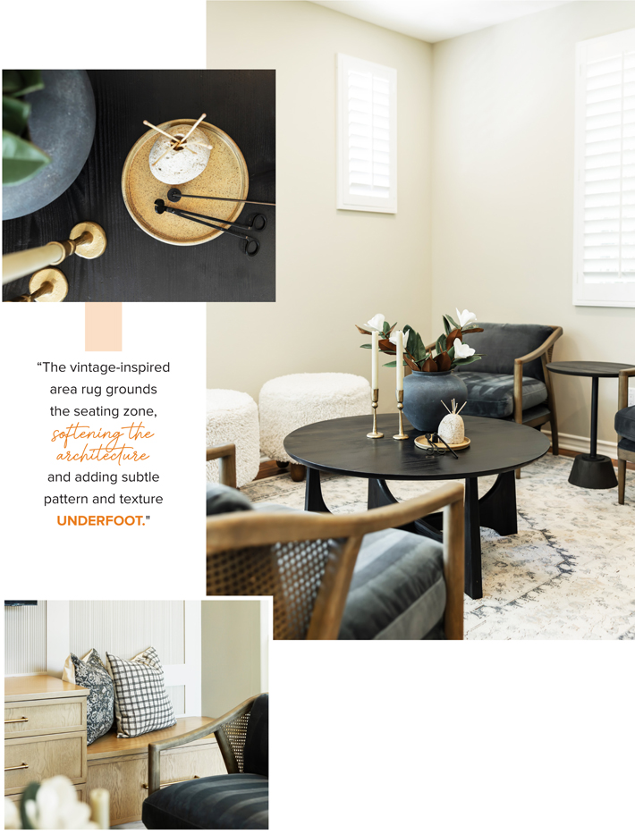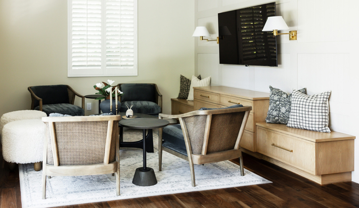 The furniture palette was carefully curated to balance structure with softness. Lounge chairs with sculptural wood frames and deep, moody upholstery introduce contrast against the lighter millwork, while woven cane detailing adds an organic layer that echoes the natural materials throughout the space. A mix of soft textiles and tailored silhouettes creates a relaxed yet elevated seating arrangement, inviting conversation while maintaining a refined visual rhythm.