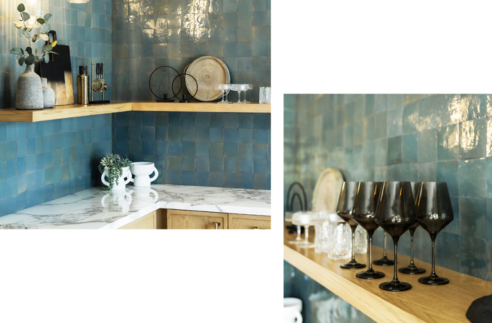 The zellege backsplash introduces subtle drama through layered texture and tonal variation, catching the light and adding movement without overpowering the palette. Floating white oak shelving above the bar offers an opportunity for curated styling. Glassware, ceramics and sculptural objects add personality and warmth.
