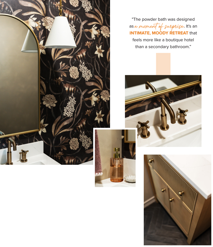 A richly-layered floral wallpaper sets the tone, wrapping the powder bath in depth and drama while introducing an organic softness through hand-drawn botanicals. The pattern creates a striking contrast against the warm, muted roman clay finish on the remaining walls. Warm brass fixtures and an arched mirror introduce a refined glow, balancing the darker elements with a sense of warmth and polish. The custom vanity, finished in a white oak with reeded detailing, adds a tailored layer that feels curated but effortless.